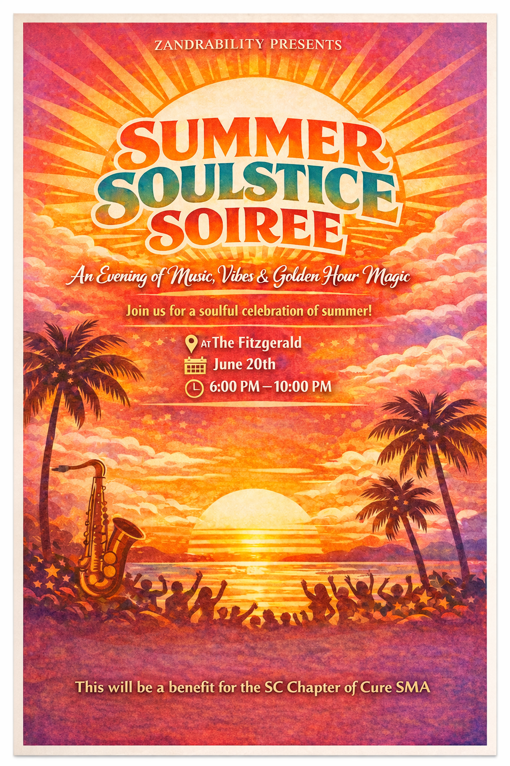 Zandrability is excited to announce that we will be presenting the 3rd Annual Summer Soulstice Soiree on June 20, 2026 @ The Fitzgerald in Tryon, NC. The event will be a benefit for the South Carolina Chapter of Cure SMA. Come help us kickoff summer with music, dancing, and good vibes.